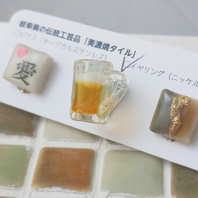 心ときめく小さなアート。 日常に彩りを添える美濃焼タイルの耳飾り。。。 岐阜県の伝統工芸「美濃焼タイル」を、遊び心あふれるデザインで耳飾りに仕立てました。 小さな一粒に凝縮された、日本の美と職人の技が、あなたの横顔に華を添えます。 ■作品の特徴■ 1. 伝統と遊び心のアート 岐阜県伝統工芸の「美濃焼タイル」を使用。釉薬の妙技が創り出す、つるりとした、なめらかな肌触りです。 一粒ひと粒、丁寧に手描きや装飾を施した、個性的なデザイン。 全品一点もの。 同じものは二つとありません。あなただけの“運命の一粒”を見つけてください。 2. 使いやすい絶妙なサイズ感 約1cm角のミニマルなデザイン。さりげないサイズながらも、確かな存在感を放ちます。 ON/OFF問わず普段使いしやすい、絶妙なバランスです。 3. スタイルを選ばない魅力 カジュアルなデニムからオフィススタイル、さらには和装にまで自然に馴染み、個性を演出します。 ■素材へのこだわり■ 金属アレルギーの方にも配慮した素材を採用しています。 【ピアス】:サージカルステンレスを使用。 【イヤリング】:ニッケルフリー仕様。 ■お手入れ・ご注文について■ 【お手入れ】:汗などがついた際は、優しい布で軽く拭き取ってください。 【発送】:ご注文確定後、3営業日以内に心を込めて発送いたします。 【プレゼントに】:大切な方へのギフトとしても大変喜ばれています。 「美濃焼タイル」の耳飾りが、日々の装いに特別な輝きを添えることを願って。。。 ご不明な点は、どうぞお気軽にお問い合わせください。 #ビール