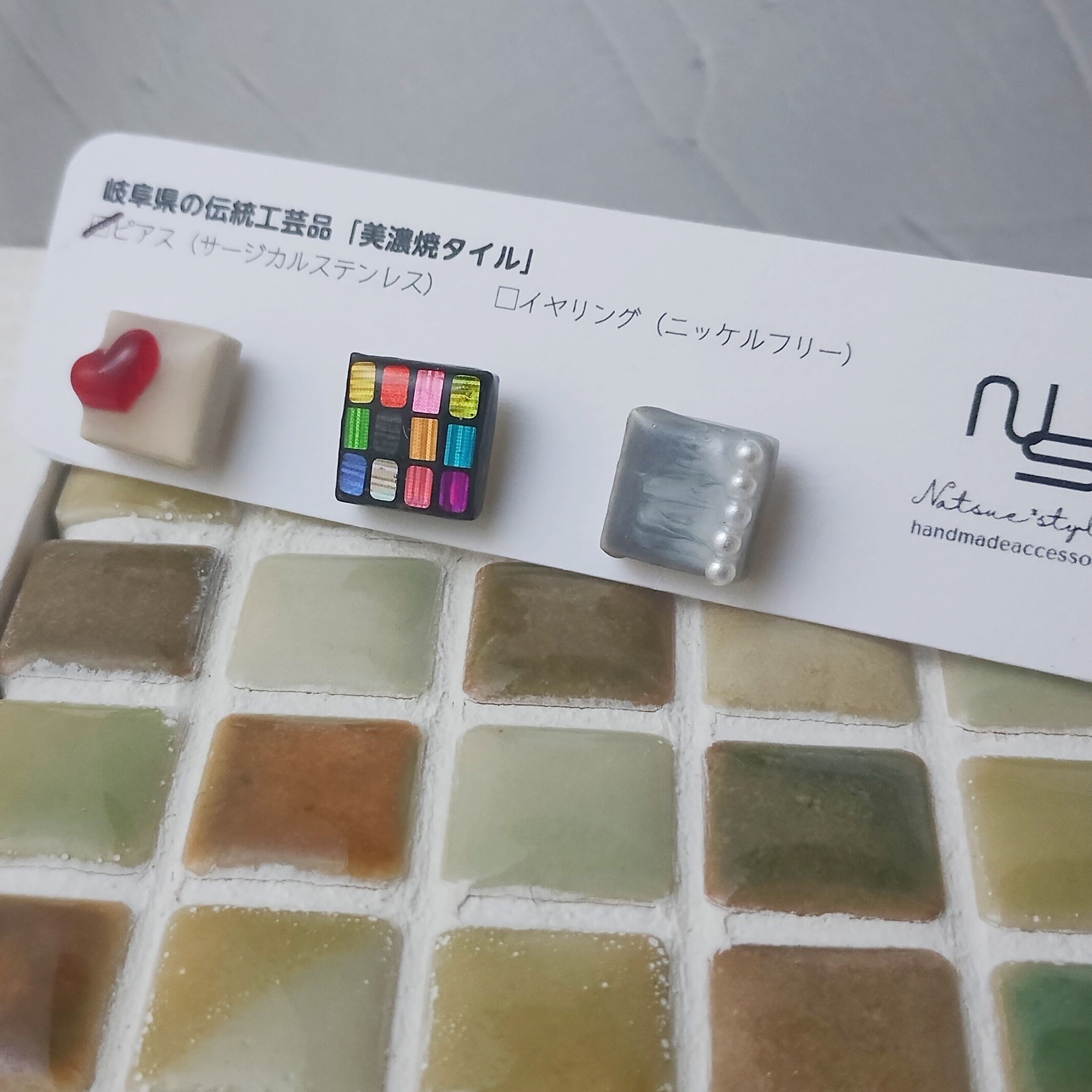 岐阜県の伝統工芸「美濃焼タイル」を、遊び心あふれるデザインで耳飾りに仕立てました。